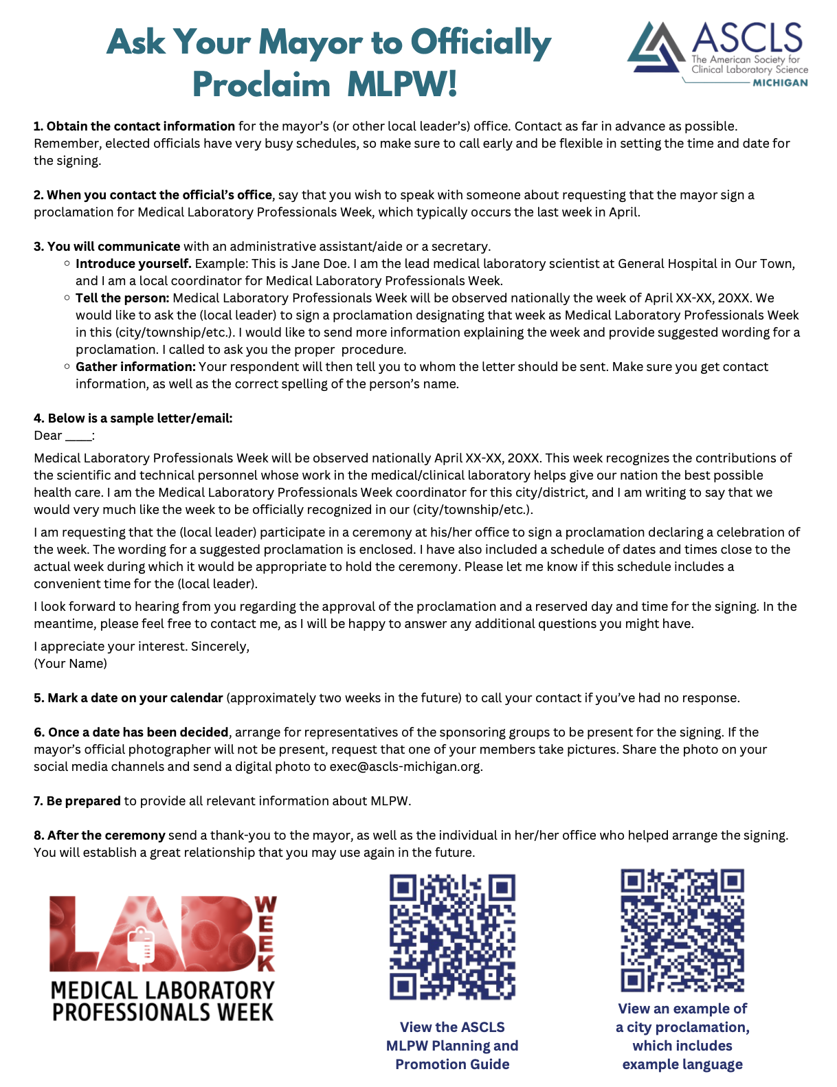 - Submit your lab’s story or photos to be featured on the ASCLS-MI website, Newslink or social media channels